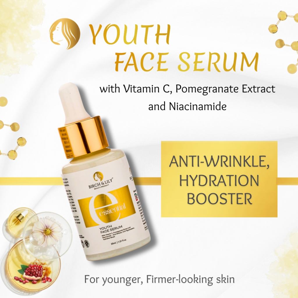 Rediscover youthful skin with Birch & Lily's Essential Youth Face Serum. This potent formula targets signs of aging, rejuvenating your skin for a more youthful appearance, making it an essential part of your skincare regimen.